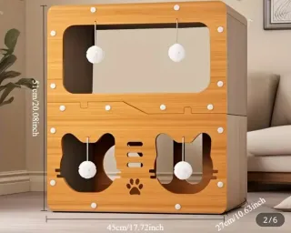 Rascador vertical para gatos con diseño de villa y cama incluida. Ideal para que tu mascota juegue y descanse. - Estructura de madera con acabado en tonos beige y marrón. - Dos niveles con entradas y plataformas. - Incluye dos pelotas colgantes para entretenimiento.