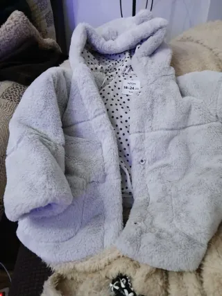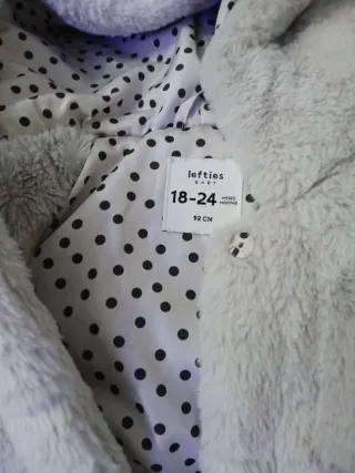Abrigo de pelo sintético para niña de la marca Lefties. Es suave y cálido, ideal para los días fríos. - Talla 18-24 meses. - Color gris claro. - Forro interior con estampado de topos negros.