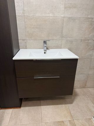 Conjunto de mueble de baño con lavabo y grifo. - Mueble de dos cajones con tiradores metálicos. - Lavabo de cerámica integrado. - Grifo de metal.