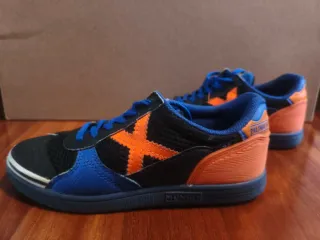 Zapatillas deportivas Munich en talla 33. Combinan negro, azul y detalles naranjas. - Cierre con cordones. - Diseño deportivo. - Suela de goma. - Extremo de los cordones deteriorado (ver imagen).