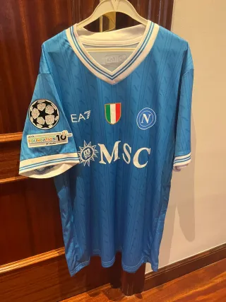 Camiseta de fútbol de la marca EA7 en color azul. - Diseño con cuello en V y detalles blancos. - Escudo del equipo y logo de la marca visibles. - Parche de la UEFA Foundation en la manga.