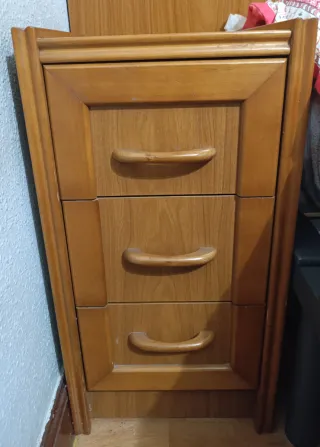 Mesita de noche con un diseño clásico y elegante. - Tres cajones con tiradores. - Acabado en madera natural.