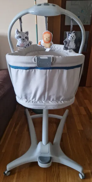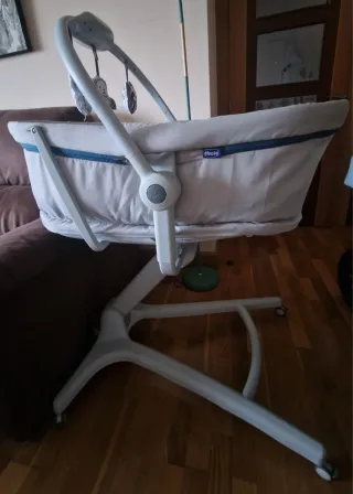 4 en 1 Mini cuna chicco multifunción. Moisés, hamaca, trona y primera silla. Mecedora con un divertido móvil para entretener al bebé. Su diseño es moderno y funcional. Altura regulable 88-122cm. Incluye colchón de la marca chicco comprado a parte. - Móvil con peluches de animales. - Estructura gris con ruedas. - Ruedas con frenos. - Peso del bebé 0-15kg - Dimensiones 60x122x85