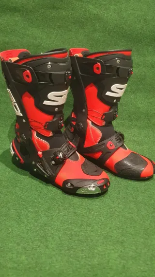 Botas de moto Sidi Rex en color rojo fluor. Han sido usadas en dos ocasiones. Talla 42 • Material Exterior: TechnoMicro • Material Interior: forradas con malla transpirable de Teflon® y con puntera de Cambrelle® • Espinilla reemplazable • 3 micro cierres Tecno3 Push • Deslizaderas con inserciones de aluminio reemplazables. • Zona del tobillo reforzada • Protección absorbente en la zona del tobillo • Ventilación en la zona de la punter • Ventilación en la zona lateral • Plantilla interior de Nylon desmontable • Suela de goma antideslizante • Homologación CE
