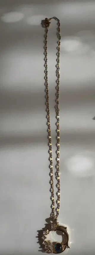 Elegante colgante con un diseño de delfín y detalles de piedras. - Diseño circular con un delfín. - Adornado con varias piedras transparentes y una piedra central azul. - Cadena dorada a juego de 40 cm.