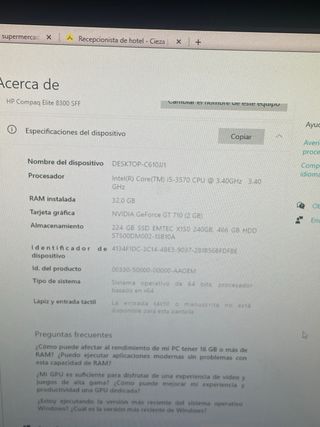 - Procesador Intel Core i5-3570 CPU a 3.40GHz. - Tarjeta gráfica NVIDIA GeForce GT 710. - Almacenamiento combinado de 224 GB SSD EMTEC X150 y 466 GB HDD ST500DM002-15810A. -comprado en el año 2021 - lleva un almacenamiento de 250gb + un disco duro instalado en su interior de 500gb de almacenamiento lo doy restablecido a la perfección. -sistema operativo original: windows 10 pro. -tipo de sistema de 64bits - funciona increíblemente bien y no me ha dado nunca ni un solo problema. -ram instalada 32gb (funcionan increible) aunque me parece q aun podia instalarse extra (creo q 2gb o 4gb) ESCUCHO OFERTAS