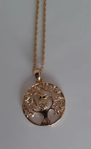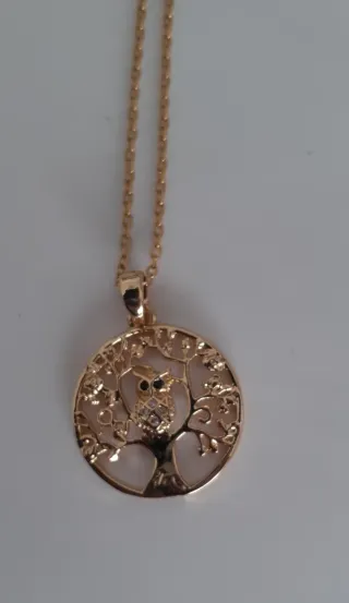 Elegante colgante con diseño de árbol de la vida y un búho. - Acabado en tono dorado. - Detalles en blanco. - Diseño circular.