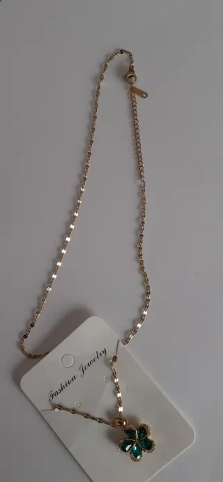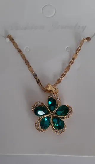 Elegante colgante con forma de flor adornada con cristales verdes y detalles brillantes. La cadena es dorada y fina. De 40 cm + 5. - Diseño de flor con cinco pétalos. - Cristales de color verde intenso. - Cadena de eslabones dorados.
