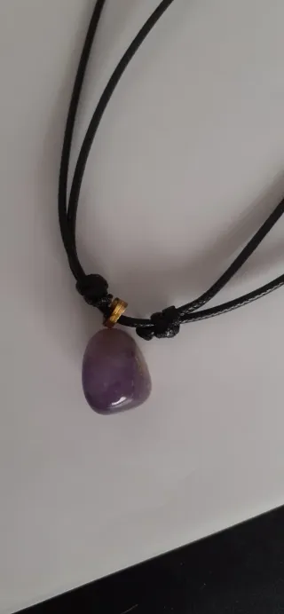 Colgante con una hermosa amatista engarzada en un detalle dorado. La piedra natural aporta un toque de color y elegancia. - Piedra de amatista pulida. - Cordón negro ajustable. - Detalle metálico dorado.