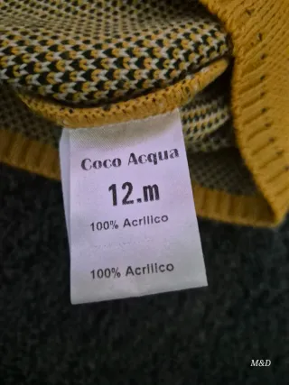 Conjunto de dos piezas para bebé de la marca COCO ACQUA. Talla 12 meses - Jersey de punto amarillo mostaza con estampado de gallina. - Pololos blancos con estampado de figuras geométricas y animales. Se puede hacer lote con mas conjuntos de mi perfil