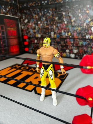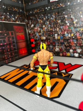 Figura de acción del luchador Rey Mysterio. - Diseño inspirado en su atuendo de lucha. - Máscara amarilla y detalles en negro y blanco en el traje. - Botas blancas.