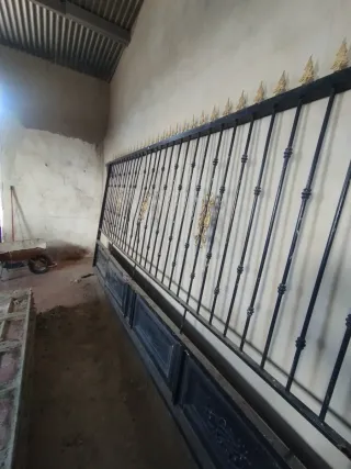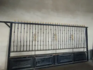 Puerta corredera de forja con diseño clásico y detalles dorados. - Estructura principal de forja negra. - Remates superiores dorados en forma de punta. - Elementos decorativos dorados en el centro. - Paneles inferiores con diseño en relieve. La puerta está para arreglarla, como se ve en las fotos. ( Si se quiere arreglar) Es muy señorial, una señora puerta. 4 metros de ancha por 2 y pico metros d alta. Precio negociable