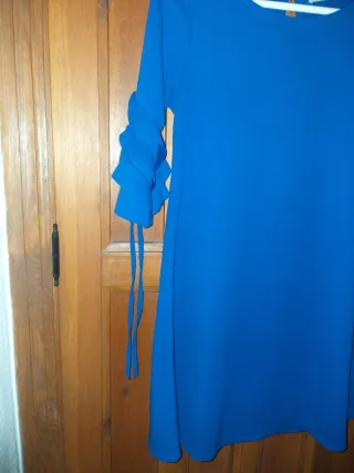 Vestido azul para chica con un diseño moderno y juvenil. Talla M/L - Manga acampanada con detalle de tiras. - Corte recto. - Cuello redondo.