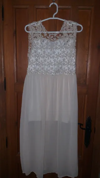 Vestido de chica con un diseño elegante y delicado. - Parte superior de encaje con motivos florales. - Falda de gasa vaporosa. - Corte asimétrico en la falda.