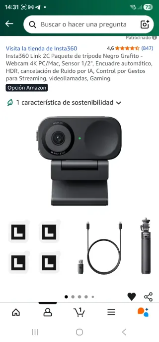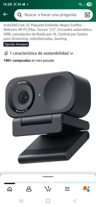 Webcam Insta360 Link 2C en color negro grafito. PRECINTADO SIN ABRIR - Resolución 4K. - Sensor de 1/2. - Encuadre automático. - HDR. - Cancelación de ruido por IA. - Control por gestos. - Ideal para streaming, videollamadas y gaming. En amazon esta en 210