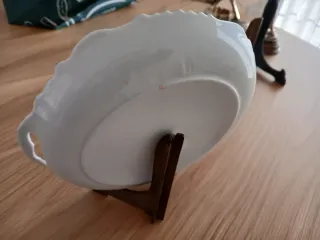 Elegante fuente para servir con un diseño clásico y detalles decorativos. - Acabado metálico plateado. - Asas laterales doradas con detalles en blanco. - Diseño con motivos florales y frutales. - Tapa con pomo central.