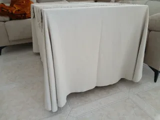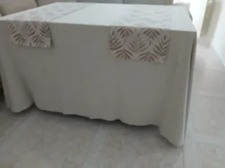 Falda para camilla y dos caminos de mesa, con un diseño elegante. - Estampado de hojas en tonos tierra. - Caída fluida y acabado cuidado.