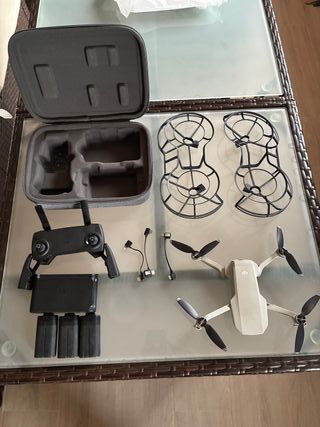 Kit completo de dron DJI Mavic Mini, con un peso de 249g. - Dron DJI Mavic Mini - Mando a distancia - Funda de transporte - Protectores de hélice - Baterías (3 unidades) - Cables de conexión