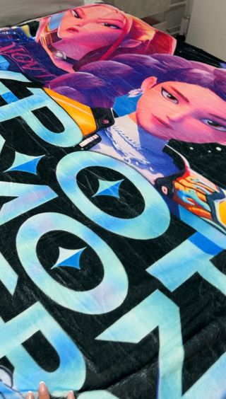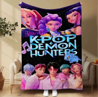 Manta 150x200cm con diseño inspirado en el KPOP y el anime. - Personajes femeninos y masculinos. - Diseño KPOP DEMON HUNTERS con notas musicales y un pequeño demonio azul. - Fondo negro con estrellas.