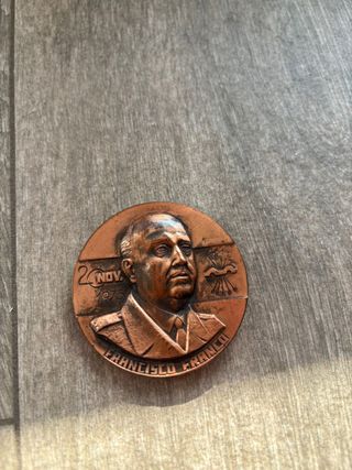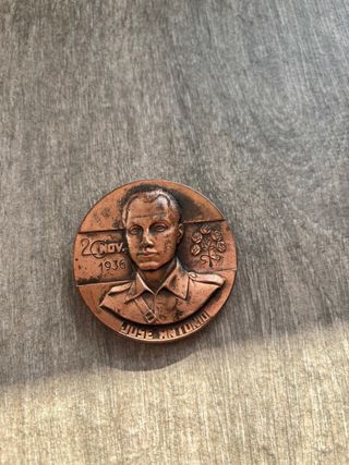 Medalla conmemorativa de bronce doble cara fallecimiento Francisco Franco y José Antonio Primo de Rivera, ambas ocurridos un 20 de noviembre de diferentes años. 5,7 cm de diámetro. Pieza única, se fabricaron muy pocas. El estado es el que se aprecia en las fotografías. Se escuchan ofertas.