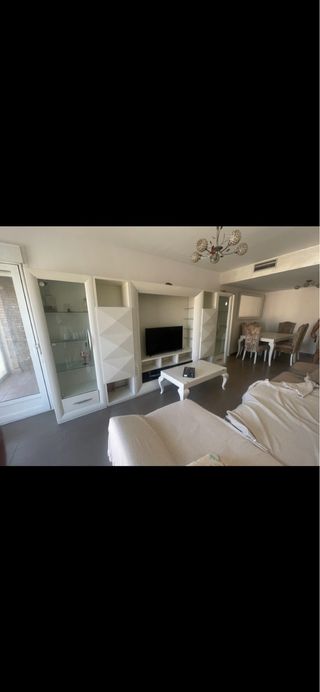 Conjunto de muebles de salón y comedor en color blanco. Incluye vitrinas, mueble de TV y mesa de comedor con sillas. - Diseño moderno con detalles geométricos. - Acabado lacado brillante. - Vitrinas con puertas de cristal. - Mesa de comedor rectangular. - Sillas tapizadas. se vende por separado o junto!