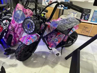 Minimoto eléctrica con un diseño único y llamativo. Ideal para desplazamientos urbanos o de ocio. - Diseño psicodélico multicolor. - Ruedas todoterreno. - Faro delantero redondo con rejilla.