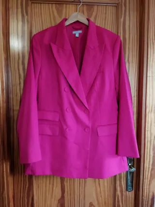 Blazer o chaqueta larga de H&M para mujer color rosa fucsia vibrante. Diseño de doble botonadura. Botones forrados del mismo tejido. Ancho de sisa a sisa 58 cm Ancho de cintura 53 cm Largo 76.5 cm Compra solidaria por los animales sin hogar. Gracias por colaborar.