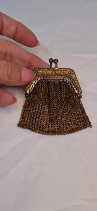 Este monedero de latón dorado presenta un diseño intrincado y elegante. - Fabricado en latón con acabado dorado. - Cierre de boquilla con dos esferas. - Cadena de malla fina. - Adornos grabados en la parte superior. Medidas: 7cm x 5cm