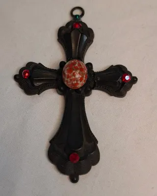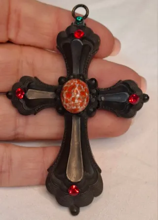 Colgante con diseño de cruz, elaborado en madera y adornado con cristales. - Detalle central ovalado con incrustaciones. - Cristales de color rojo. - Elemento decorativo superior con pequeño cristal verde. Es de principios del Siglo XX. Está restaurada ver fotos. Tallada a mano. Medidas: 7,5 cm x 5,5 cm