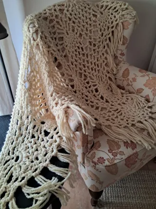 Precioso chal tejido a mano con un intrincado diseño de crochet. Su color beige y los flecos le dan un toque bohemio y elegante. #vintage #chal #lana #crochet #flecos #bohemio #moda - Material: Lana - Técnica: Crochet - Adorno: Flecos