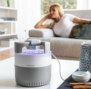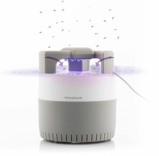 Lámpara antimosquitos de la marca InnovaGoods, modelo KL Silen. Diseñada para atraer y eliminar insectos. - Tecnología de succión. - Luz UV. - Diseño moderno en gris y blanco.