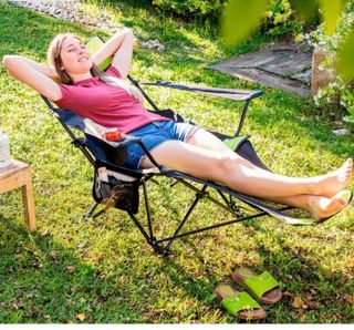 Silla tumbona plegable Kampfort, ideal para camping y exteriores. Diseñada para ofrecer comodidad y portabilidad. - Reposacabezas acolchado. - Soporte para bebidas integrado. - Bolsillo lateral de malla. - Reposapiés extensible.