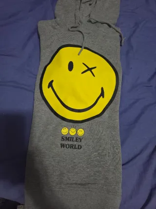 Sudadera gris con estampado de Smiley World. - Diseño con caritas sonrientes. - Estampado frontal grande de smiley. - Texto SMILEY WORLD en lateral. - con capucha - talla grande, es una m xo puede valer hasta una xl