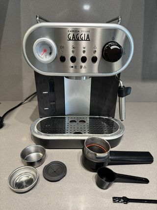 Gaggia Cafetera manual Carezza Deluxe RI8525/01 para café molido y cápsulas, 230 V, 50 Hz, 1900 W, gris/negra - Usada de forma domestica, descalcificada cada vez que la maquina lo pide. Cuidada muy bien pero desgaste en portafiltro y bandeja por limpiarlos en lavavajillas, ver fotos. - Incluye portafiltros, dosificador y accesorios. Ver fotos. - Indicador de presión. - Bandeja de goteo extraíble. - 100% fabricado en Italia - Incluye 2 filtros: 1 filtro de café molido, 1 o 2 tazas y 1 filtro para cápsulas de papel individuales, con adaptador - El clásico espumador de leche de acero inoxidable distribuye vapor para emulsionar la