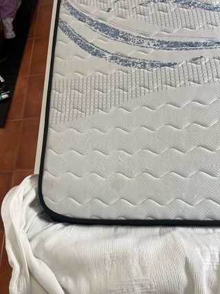 Colchón viscoelástico de la marca Naturalex, con medidas de 140x200 cm. Presenta un diseño con motivos circulares en tonos azules sobre fondo blanco. Espuma ultra transpirable. 15cm grosor. - Buen estado. - Tejido exterior de poliéster. - Núcleo viscoelástico. Pequeñas marcas de uso. Recogida en Albaida, Valencia