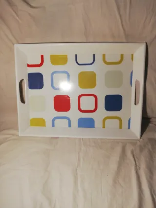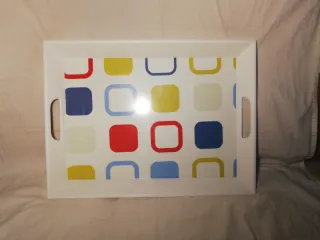 Bandeja grande (51x38 cms) de plástico duro. Borde biselado y ancho (5 cms). Con este borde es más difícil que algo te pueda caer de la bandeja. De color blanco con un diseño de cuadrados en rojo, azul, amarillo y blanco en el fondo. Bordes blancos. Asas en medio del borde para facilitar el transporte. Facil limpieza. Es un material que no se mancha, con agua y jabón se limpia fácilmente. Sin sitios escondidos dificiles de limpiar.