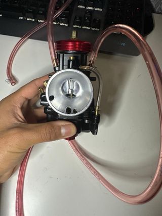 Carburador ALLPRO tipo PWK de 21mm con Powerjet. - Color negro con detalles en rojo y dorado. - Incluye mangueras de combustible. - Marca ALLPRO visible en el cuerpo. Carburador 21mm tipo pwk cuerpo negro tapa enc rojo allpro diametro del exterior 34-35mm diametro filtro de aire 49-50mm chicle tipo PWK cuerpo tipo PWK carburador PWK 21- chicle de alta 105- baja 38-powerjet 32 ideal para cilindros 50-70