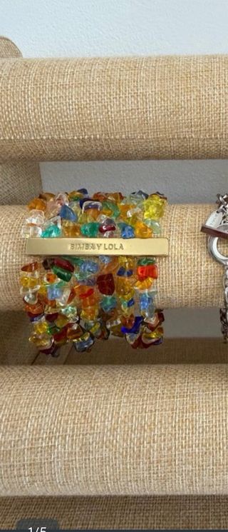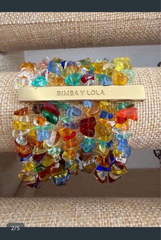 Pulsera de la marca BIMBA Y LOLA con un diseño vibrante y llamativo. - Piezas de cristal de colores variados. - Detalle central metálico dorado con el logo de la marca.