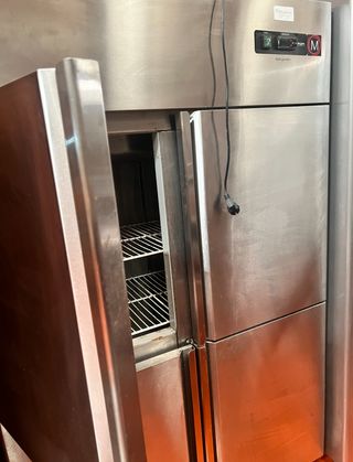 Cámara frigorífica de acero inoxidable, ideal para negocios de hostelería o alimentación. - Diseño de cuatro puertas. - Acabado en acero inoxidable.