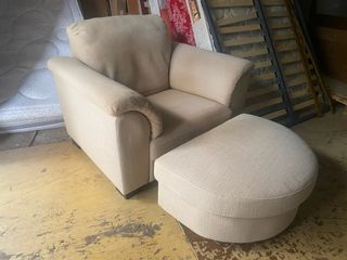 Cómodo sillón con su pouf a juego, perfecto para crear un rincón de descanso. - Tapicería de tela. - Diseño moderno y elegante.