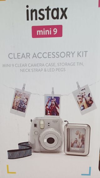 Kit de accesorios para cámara Fujifilm Instax Mini 9. - Funda protectora transparente camara y funda protectora transparente pelicula. - Correa para colgar. - Filtros de colores para lente. - Baterías. - Paquete de película Instax Mini.