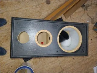 Caja de altavoz con un diseño elegante. - Acabado en negro y marrón. - Espacio para varios altavoces.