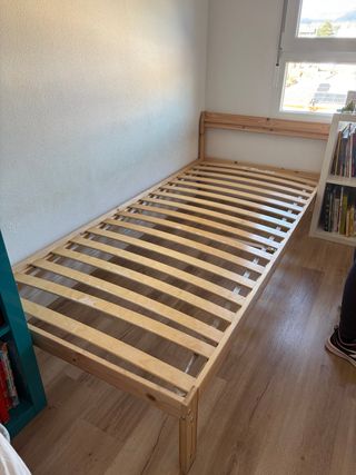 Cama individual de pino con somier de láminas. - Estructura de madera. - Somier de láminas - Diseño sencillo y funcional. - 90x200 Precio nuevo en la tienda 69€. Tengo dos camas iguales, 30€ por una cama con somoer, 50€ por las dos camas con los dos somier. Se recoge en Albatera, Alicante.