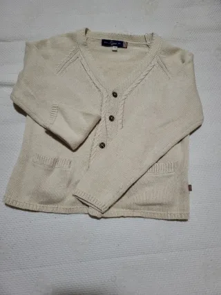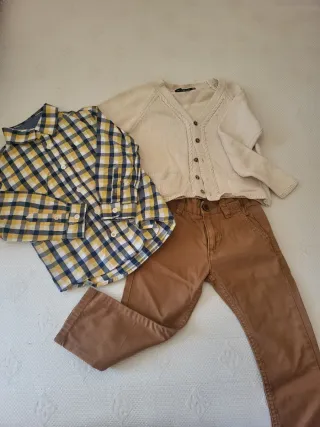 Conjunto de ropa para niño, ideal para combinar. - Camisa de cuadros en tonos azul, blanco y amarillo. - Pantalón marrón tipo chino. - Jersey de punto color crema con botones.