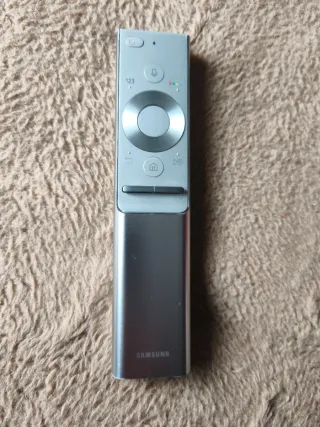 Mando a distancia plateado para TV. - Diseño moderno y elegante. - Botones de navegación intuitivos. - Parte inferior metálica brillante.