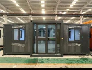 Casa contenedor expandible con diseño moderno y funcional. Ideal para adaptarla a tus necesidades. - Estructura metálica gris. - Puerta doble de cristal. - Dos ventanas laterales con marco oscuro.