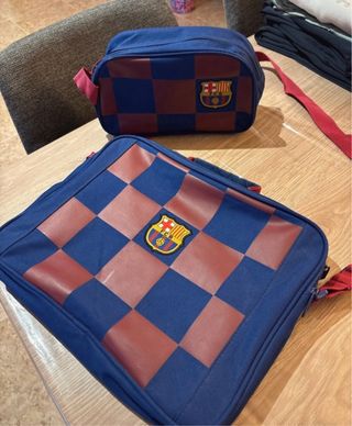 Set de dos artículos del FC Barcelona con diseño a cuadros. - Mochila con cremallera y asa. - Neceser con asa lateral.