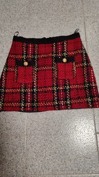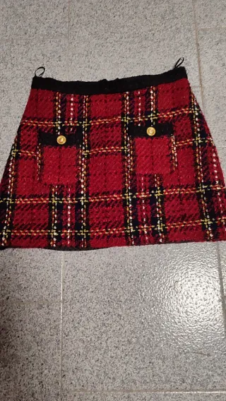 Falda de Zara con un diseño de cuadros llamativo. - Tejido tipo tweed. - Detalle de bolsillos delanteros con botón dorado. - Cintura con acabado negro. - Largo mini.