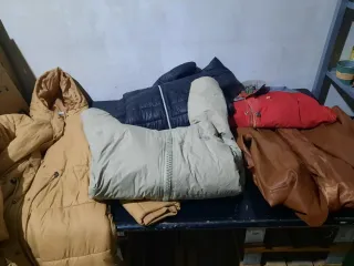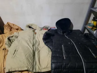 Lote de chaquetas de diferentes estilos y colores. - Chaqueta marrón estilo cuero. - Chaqueta beige acolchada. - Chaqueta marrón clara con capucha. - Chaqueta negra. - Chaqueta roja Promoción asta final de mes