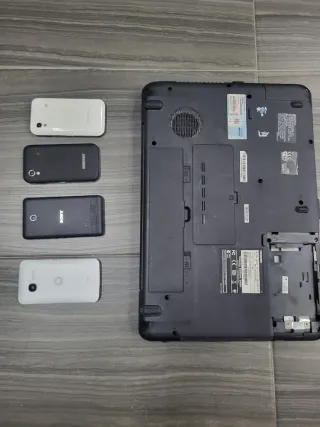 Se vende lote de cuatro teléfonos móviles y un portatil toshiba. Se vende lote como averiado no hay devolucion. Los 2 moviles samsung encienden.